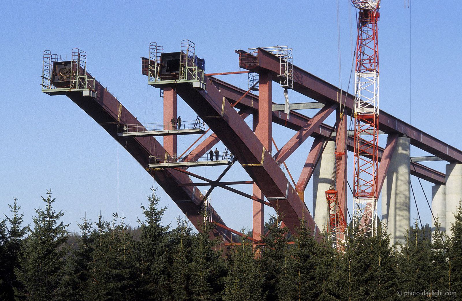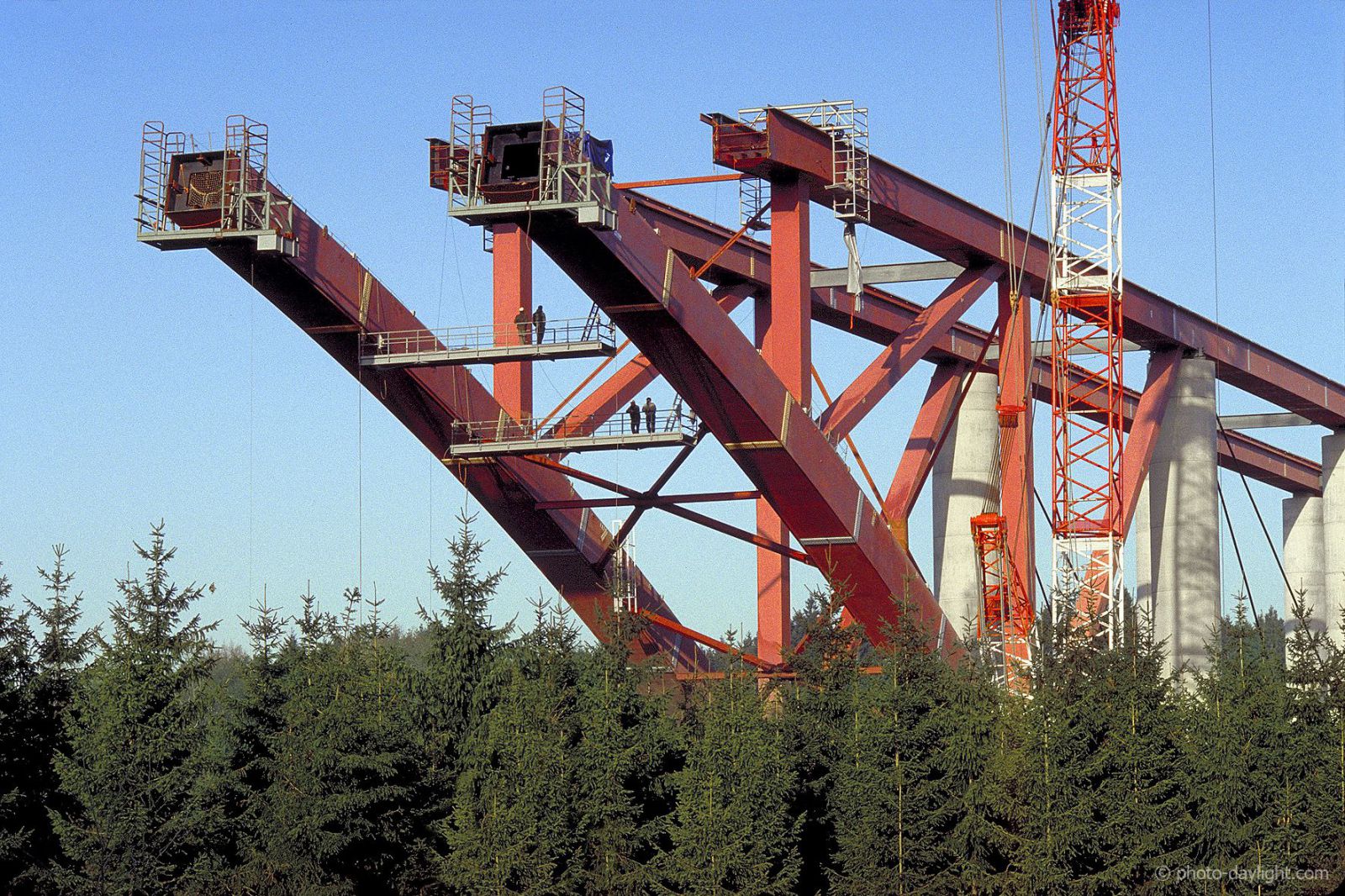 The composite deck was partially launched and partially erected by crane. It is composed of a concrete deck without cross girders and two rectangular steel boxes