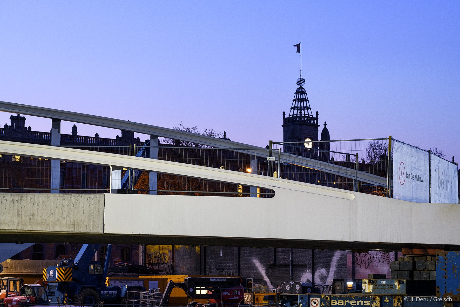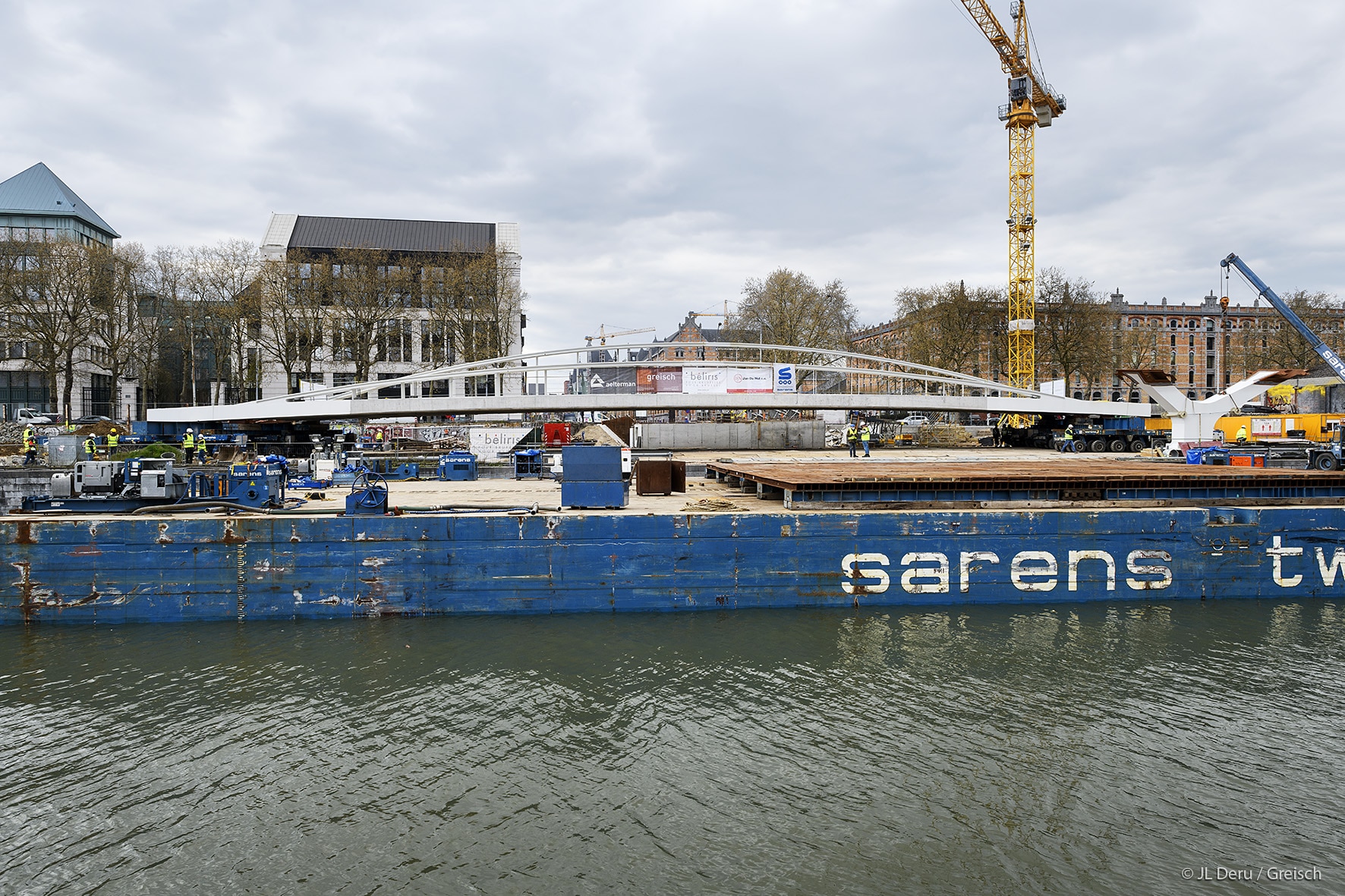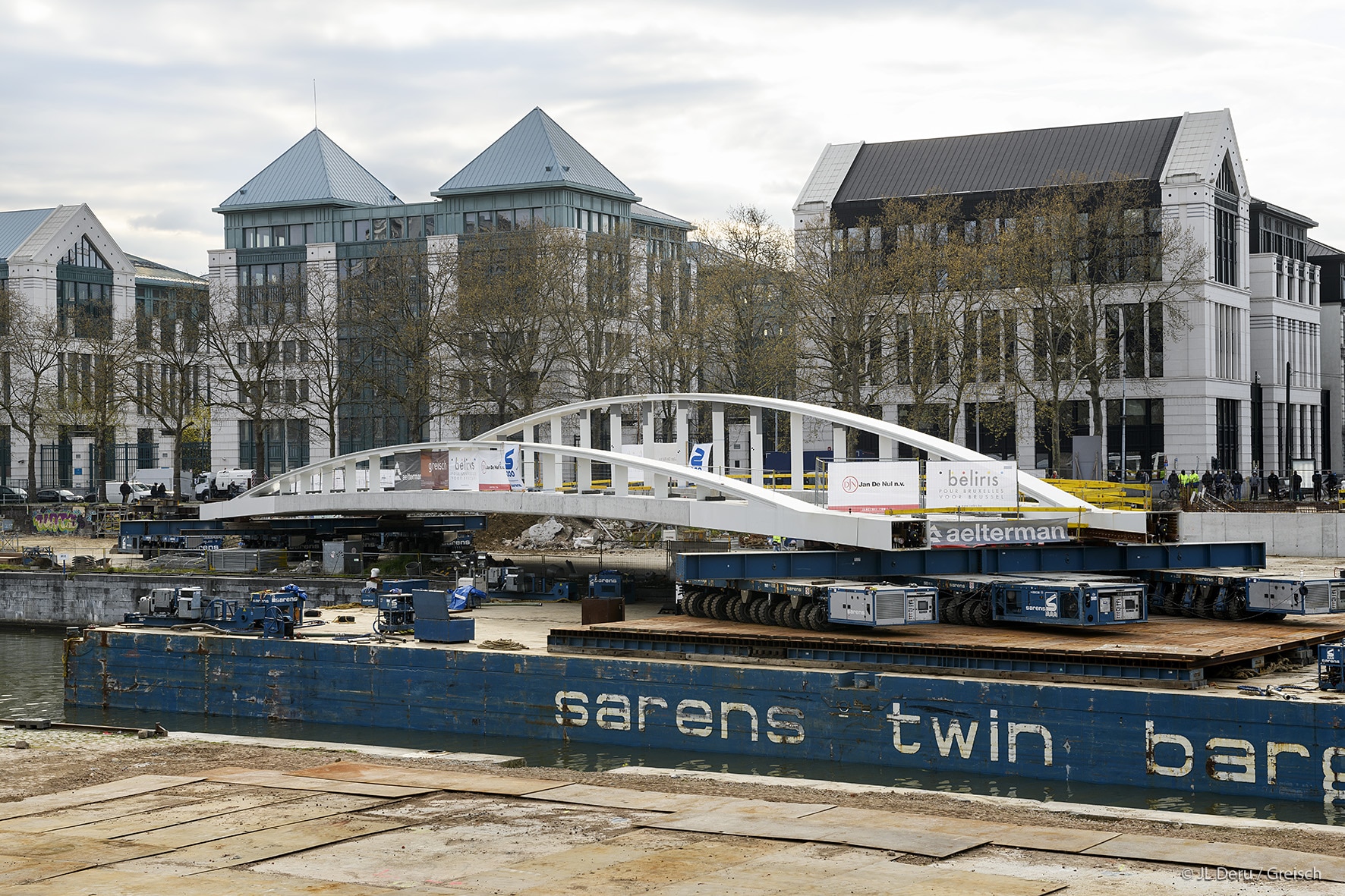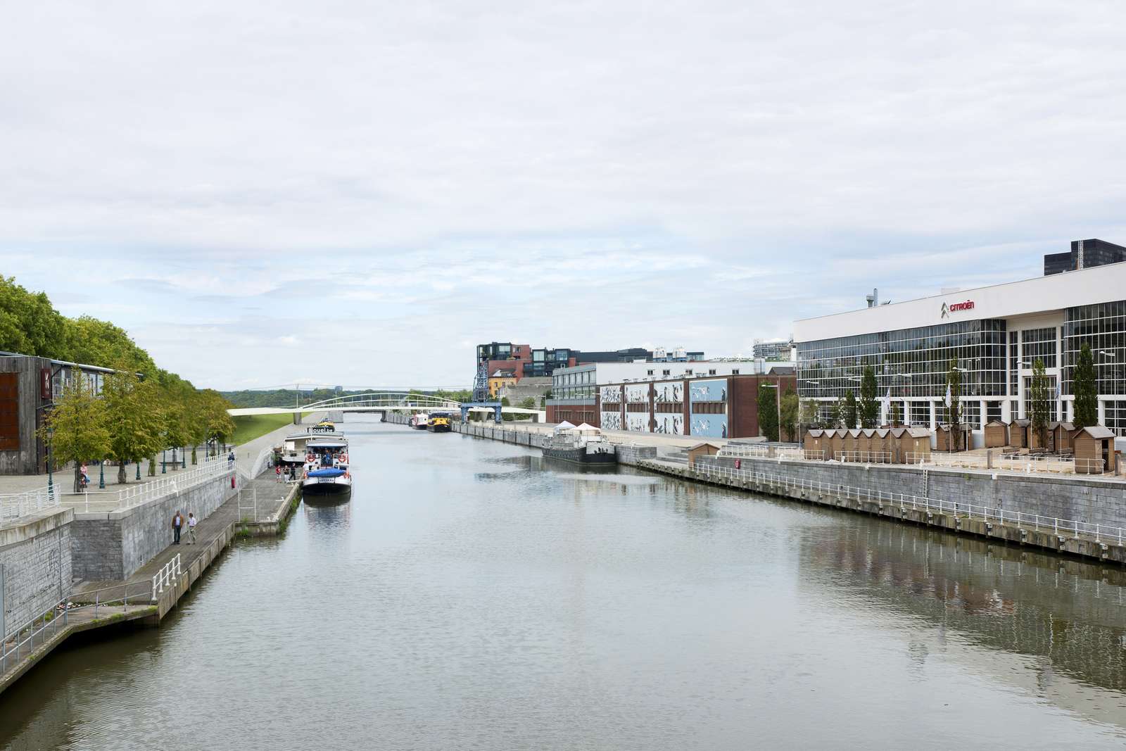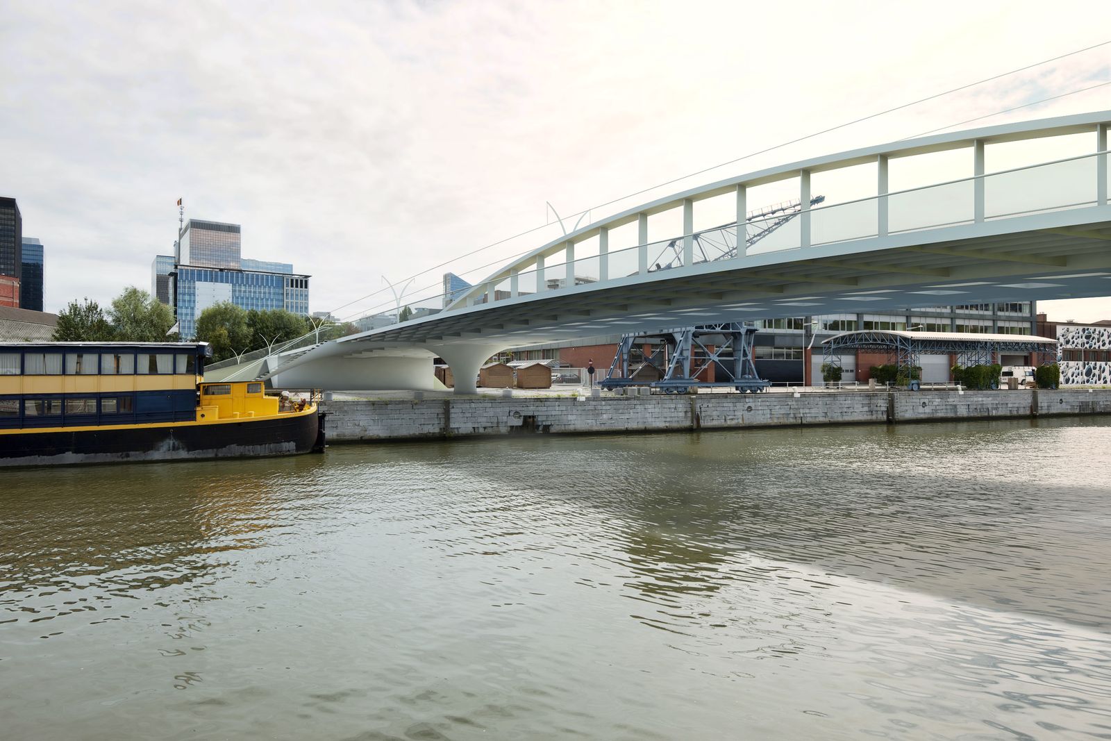 The transverse dissymmetry of the structure frees the pedestrian vision on the canal and the site of Tour & Taxis.The design of the bridge supports on the docks took into account the recommendations of the masterplan of Michel Desvigné, landscape architect, for future green spaces along the Quai des Matériaux.