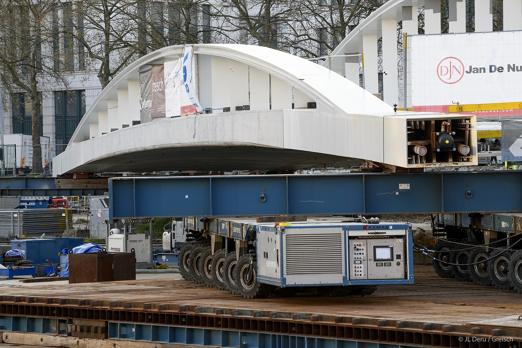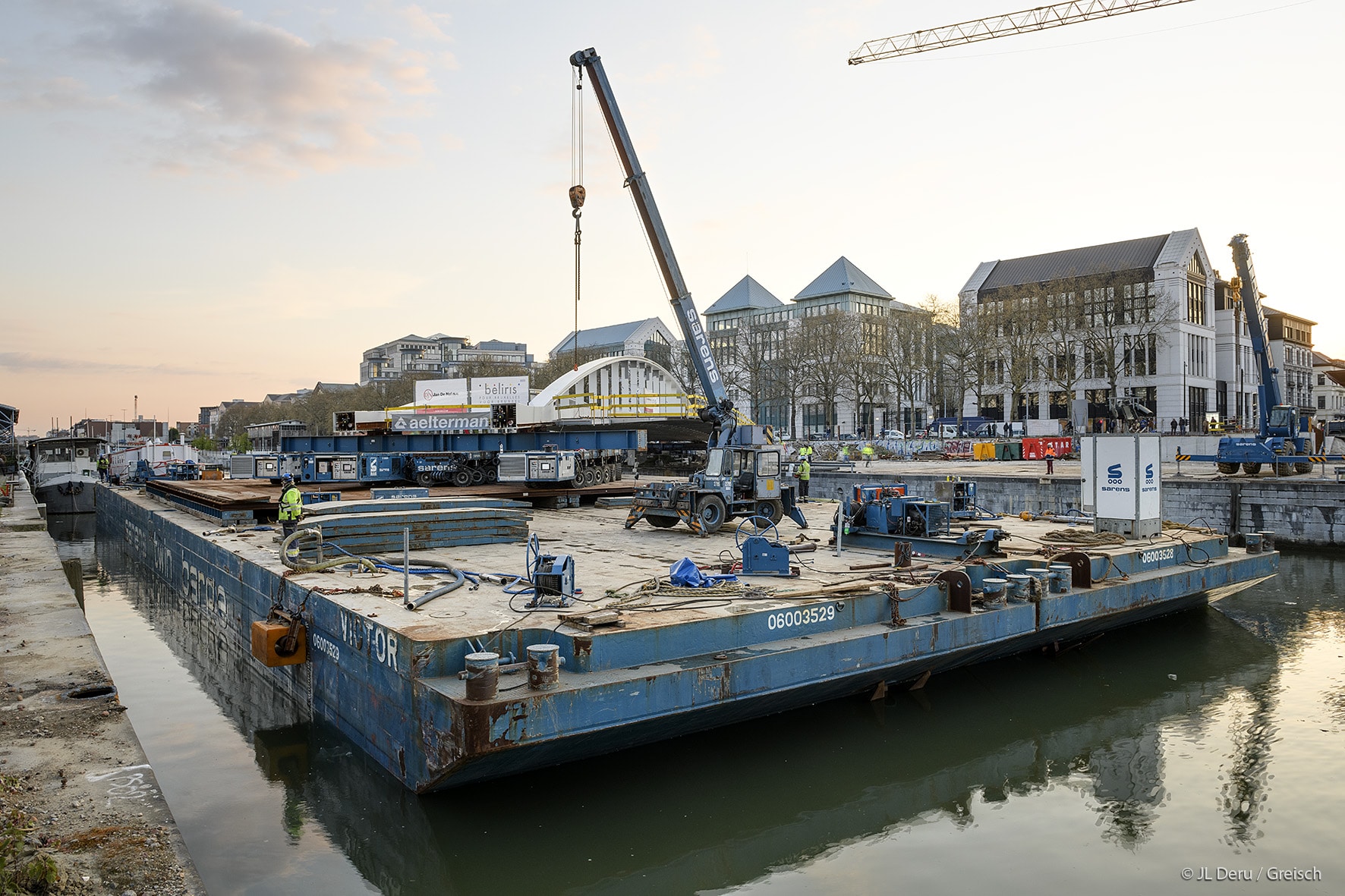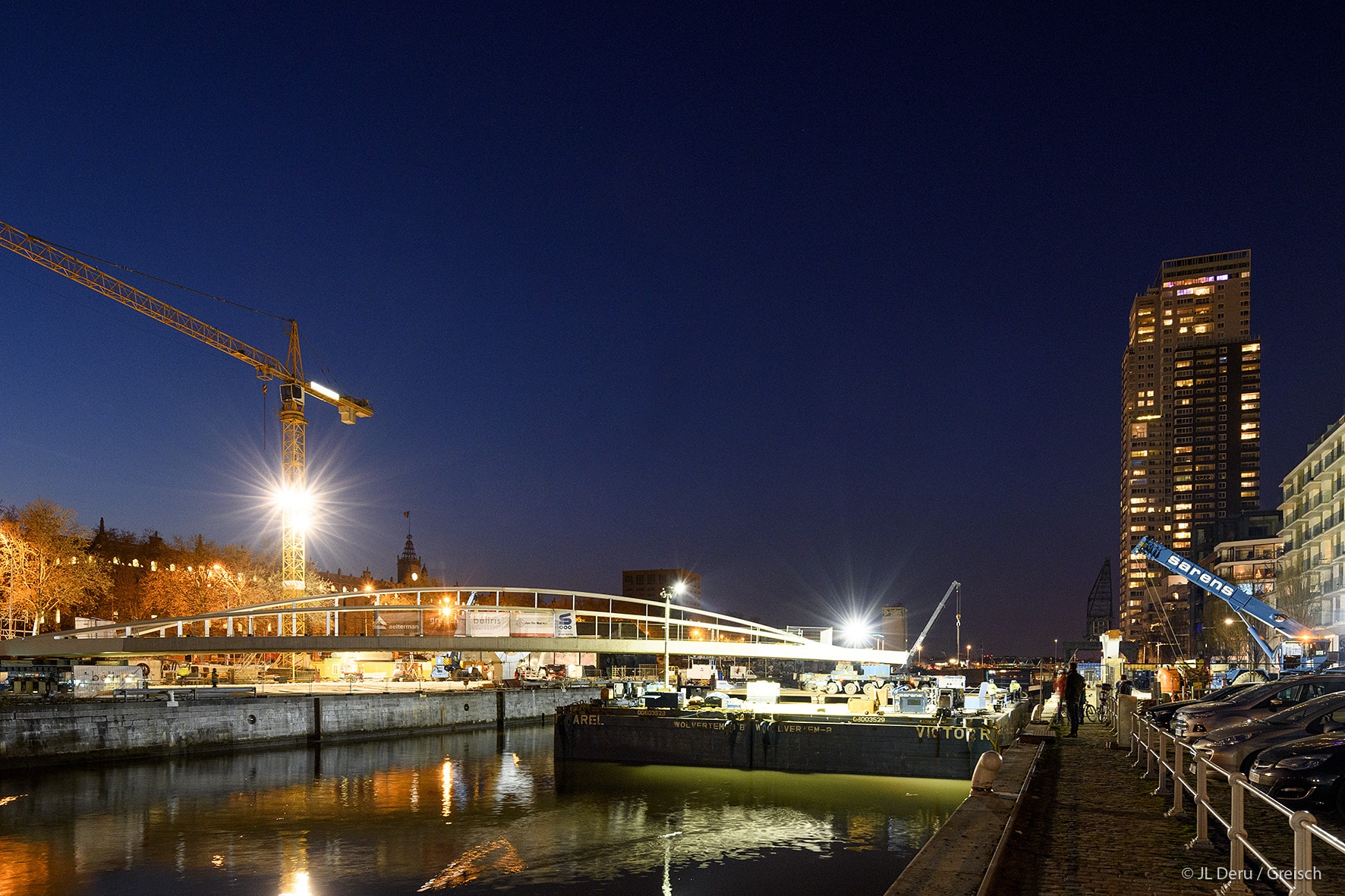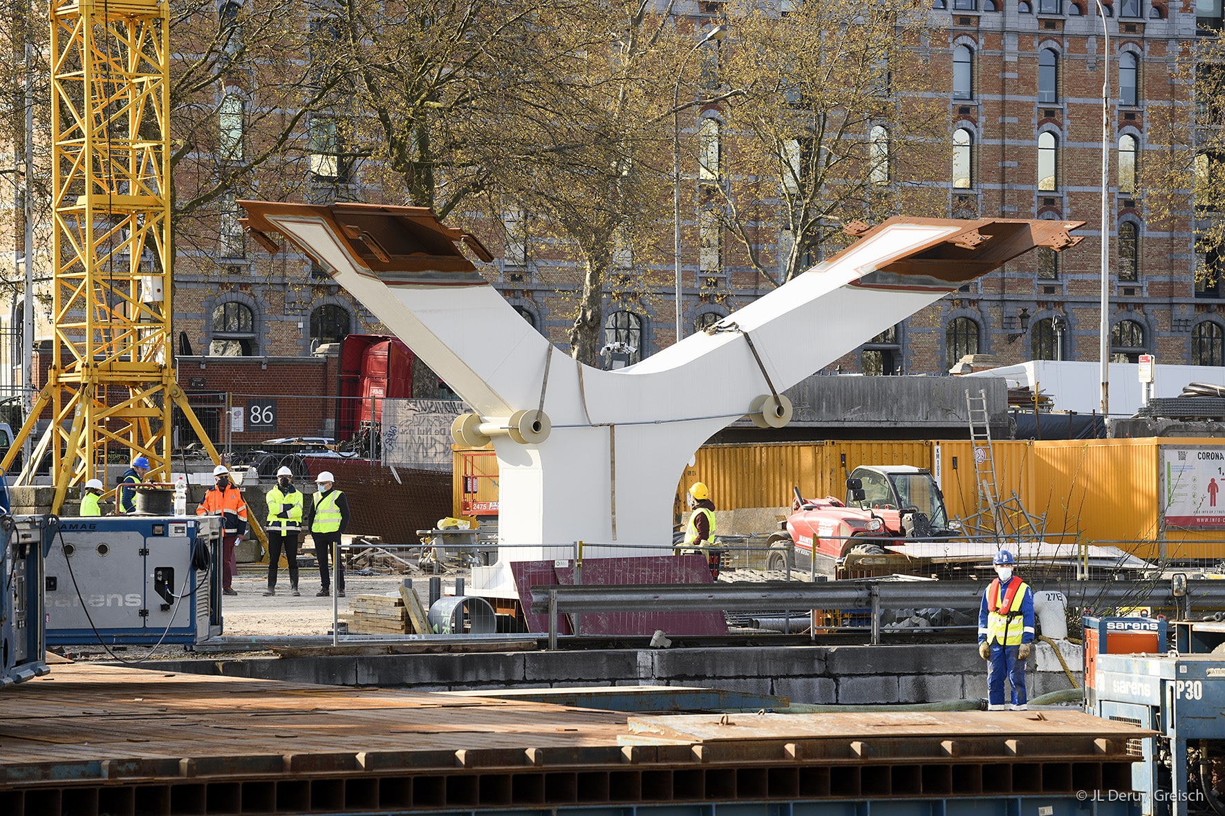 The transverse dissymmetry of the structure frees the pedestrian vision on the canal and the site of Tour & Taxis.The design of the bridge supports on the docks took into account the recommendations of the masterplan of Michel Desvigné, landscape architect, for future green spaces along the Quai des Matériaux.