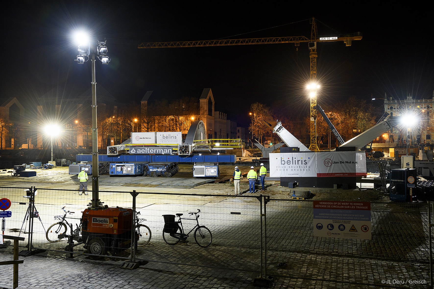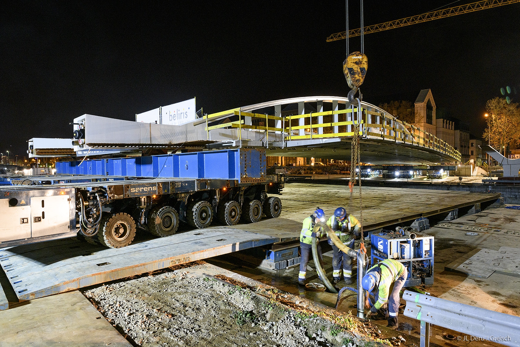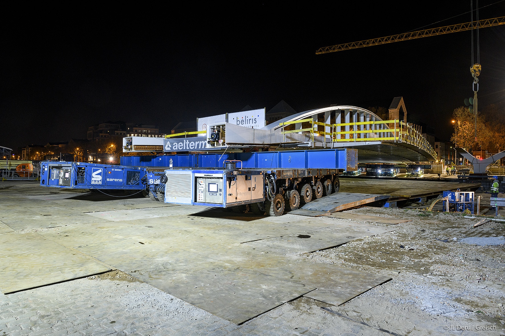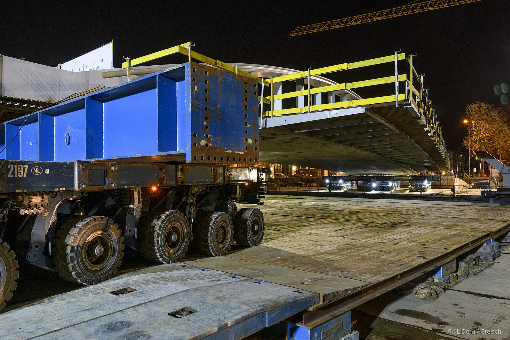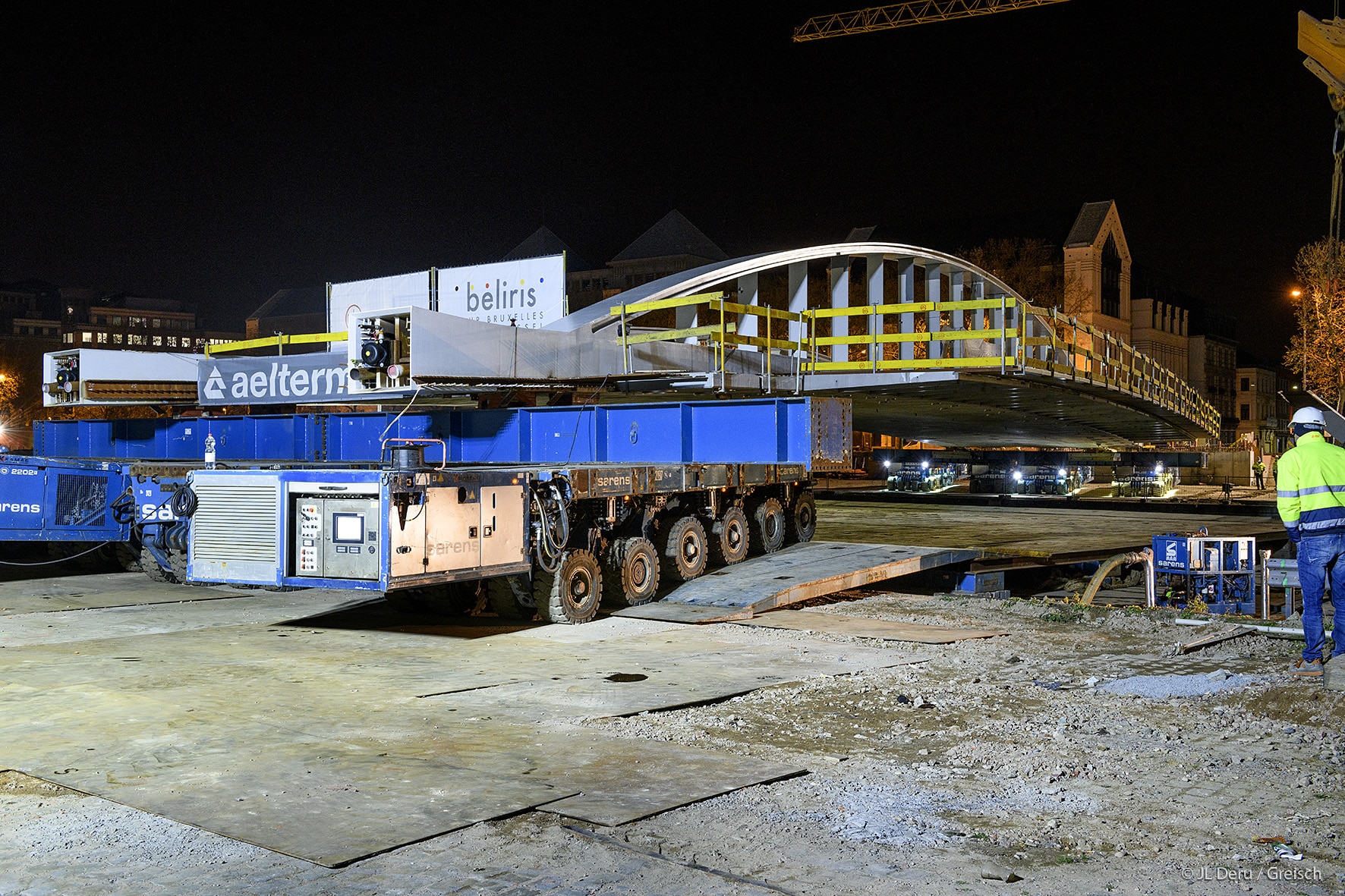 The transverse dissymmetry of the structure frees the pedestrian vision on the canal and the site of Tour & Taxis.The design of the bridge supports on the docks took into account the recommendations of the masterplan of Michel Desvigné, landscape architect, for future green spaces along the Quai des Matériaux.