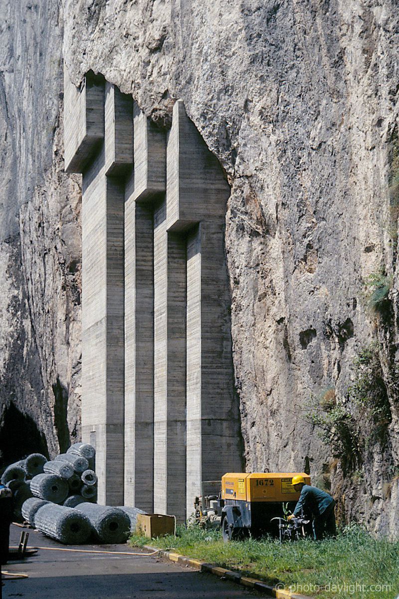 Le chantier a consisté dès lors à sécuriser entièrement la paroi (longueur 160 m et hauteur jusque 85 m) par la mise en oeuvre de filets métalliques plaqués(600 m²), d’un grillage pendu (9.000 m²), d’ancrages passifs (1.300 p) et de deux contreforts en béton armé (340 m³).