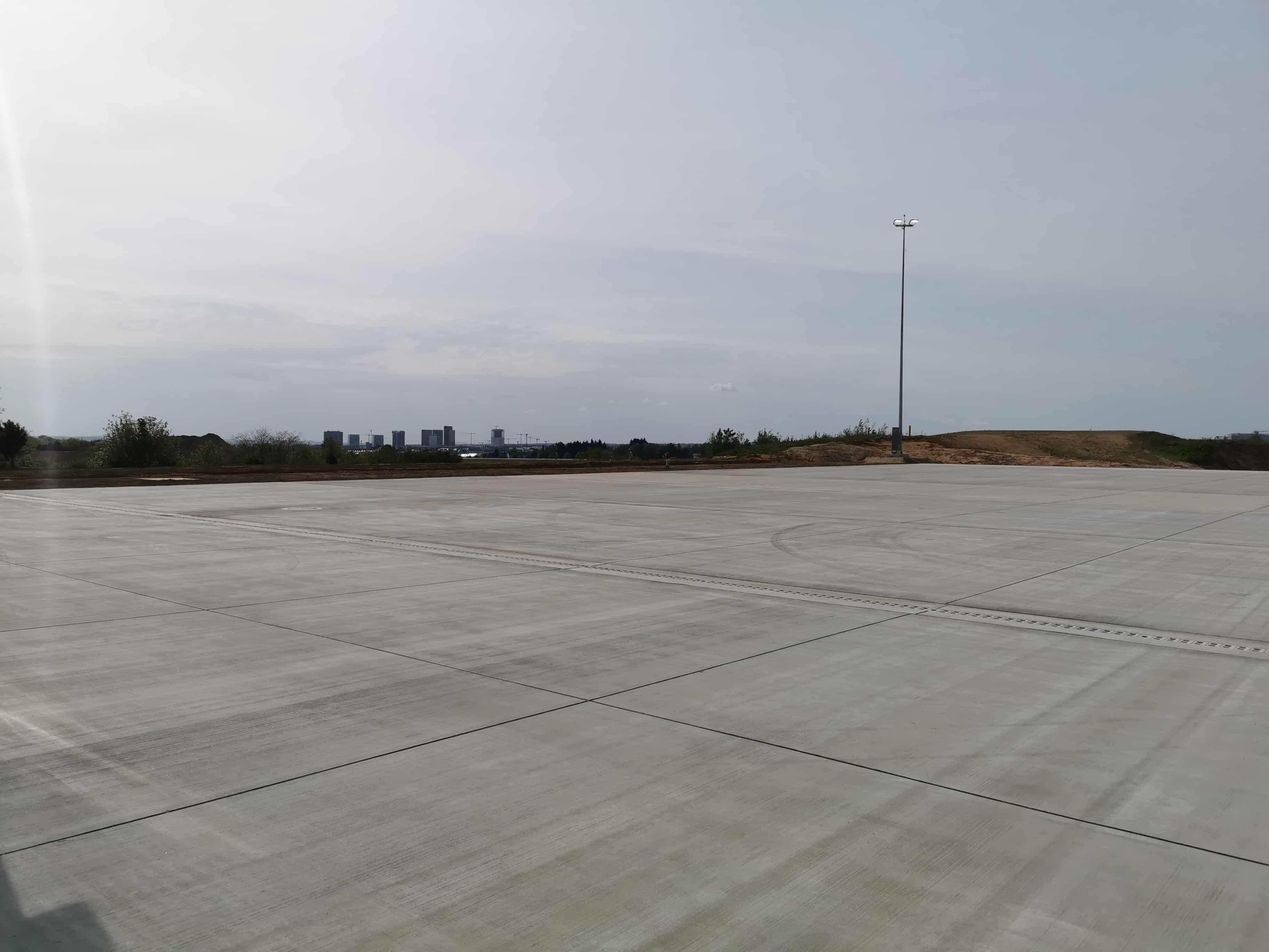 Les études des abords de ce bâtiment font également partie des prestations du Bureau Greisch Luxembourg. Il s’agit en l’occurrence de l’éclairage routier entre la route nationale et le bâtiment (+/- 400 m de route), les parkings employés et visiteurs, l’étude complète du poste de garde qui fait la séparation entre la zone airside et la zone landside, ainsi qu’un parking à avions d’une surface approximative de 10 000 m².