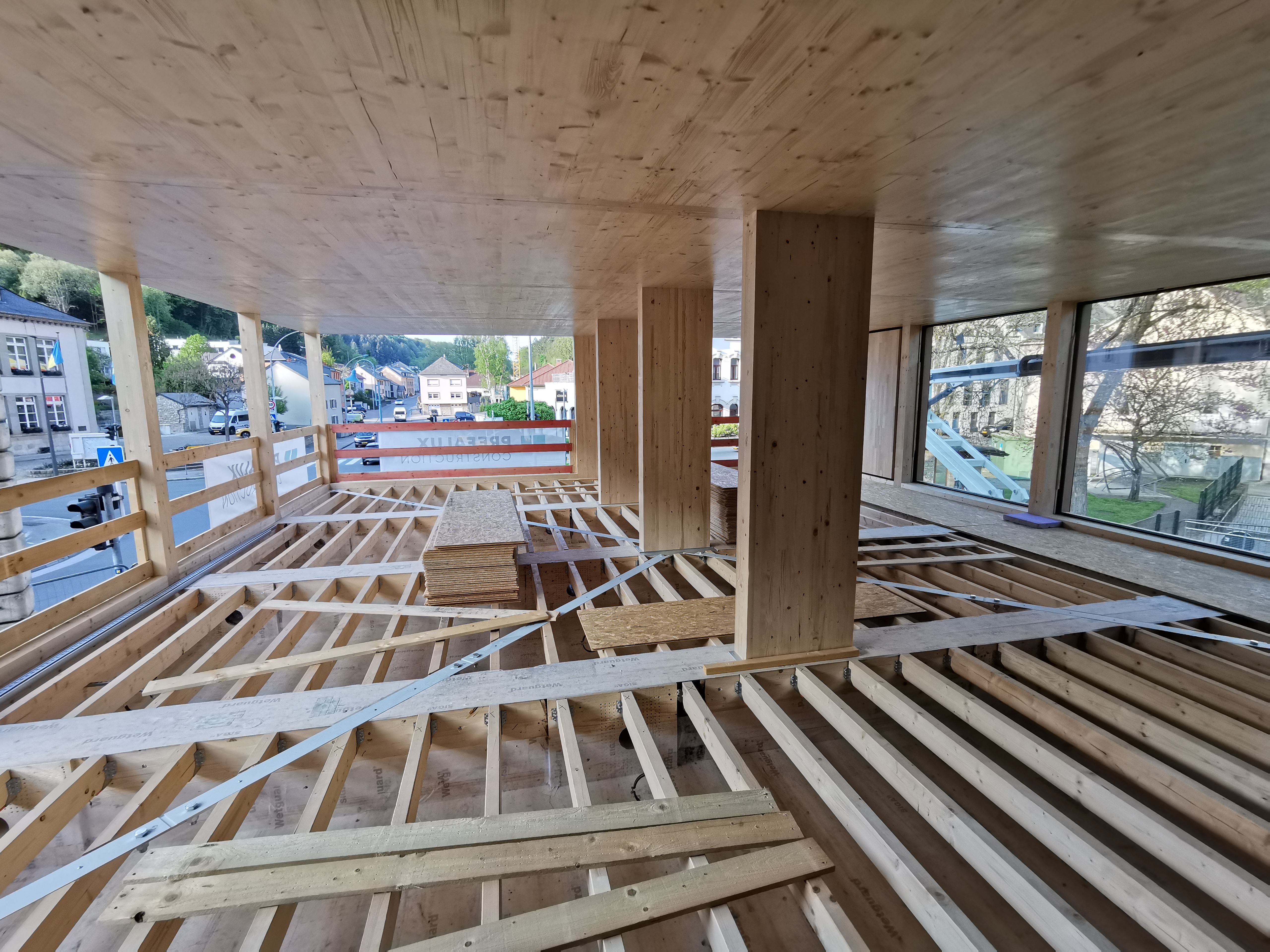 La structure, particulièrement régulière et rationnelle, est constituée de poutres et colonnes en lamellé-collé d’une portée de 4,5 m, tandis que les planchers et parois sont en CLT de 2,5 m.