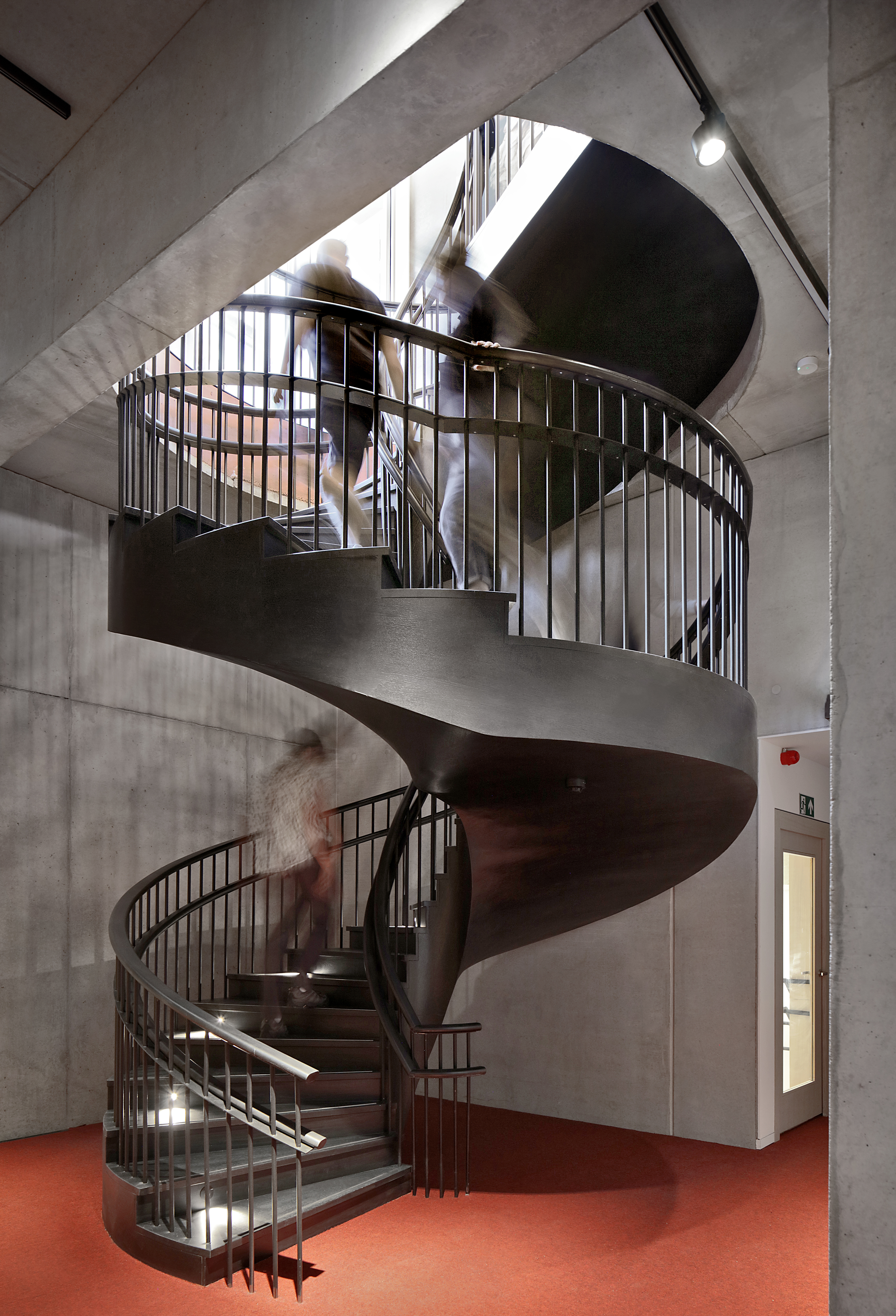 Aux étages, les planchers en béton apparent franchissent des portées de 11 mètres. Les planchers fins sont aperçus à travers la façade vitrée et intègrent un système d’activation du noyau de béton. L’ensemble de ces contraintes a conduit au choix d’une dalle élégie sur prédalles architectoniques, avec de la postcontrainte sur les zones les plus chargées.