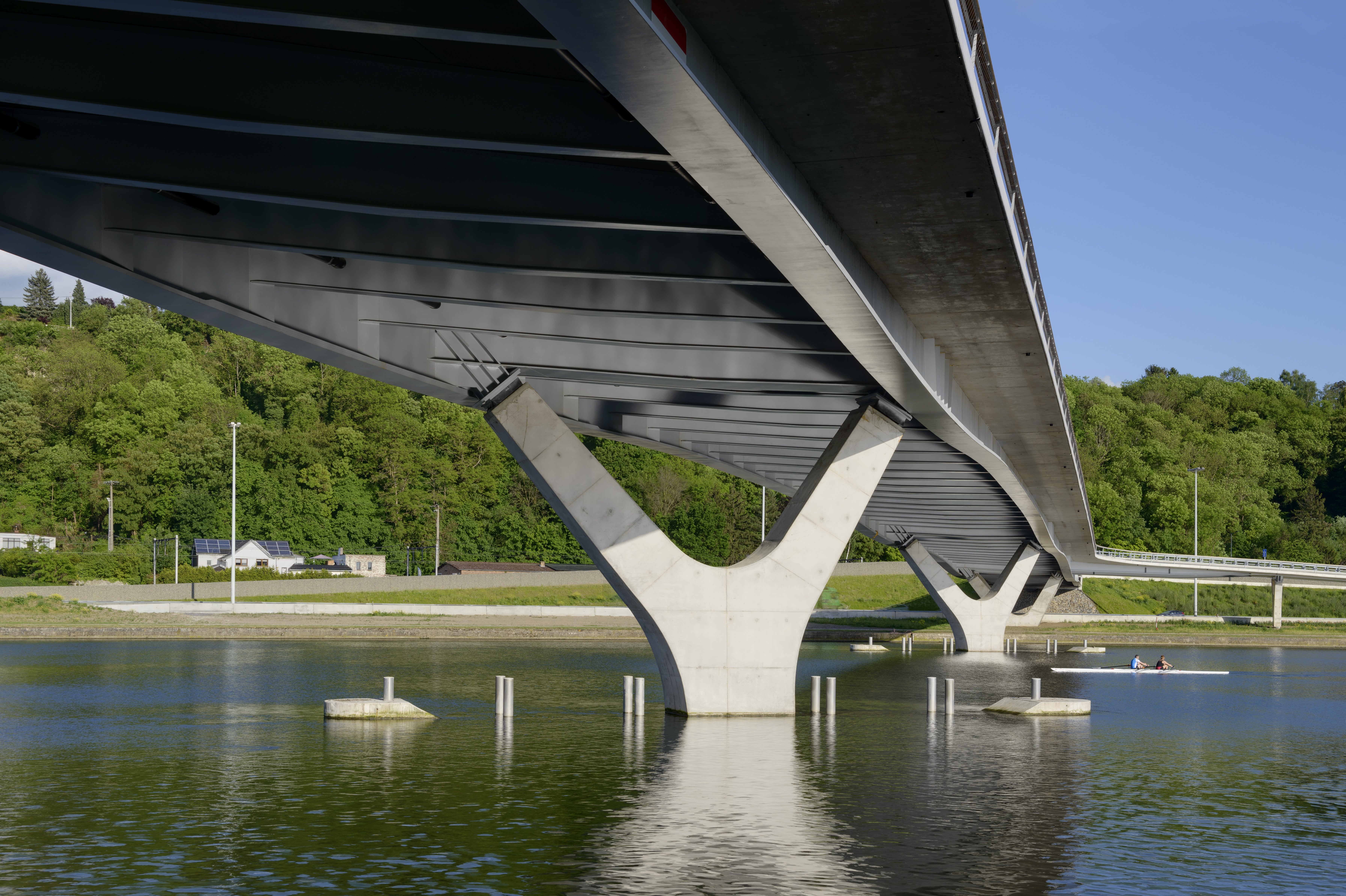 L’ouvrage assure aussi une connexion entre les deux rives pour les modes doux via un trottoir placé en encorbellement sur la poutre amont et donc à l’écart de la circulation.