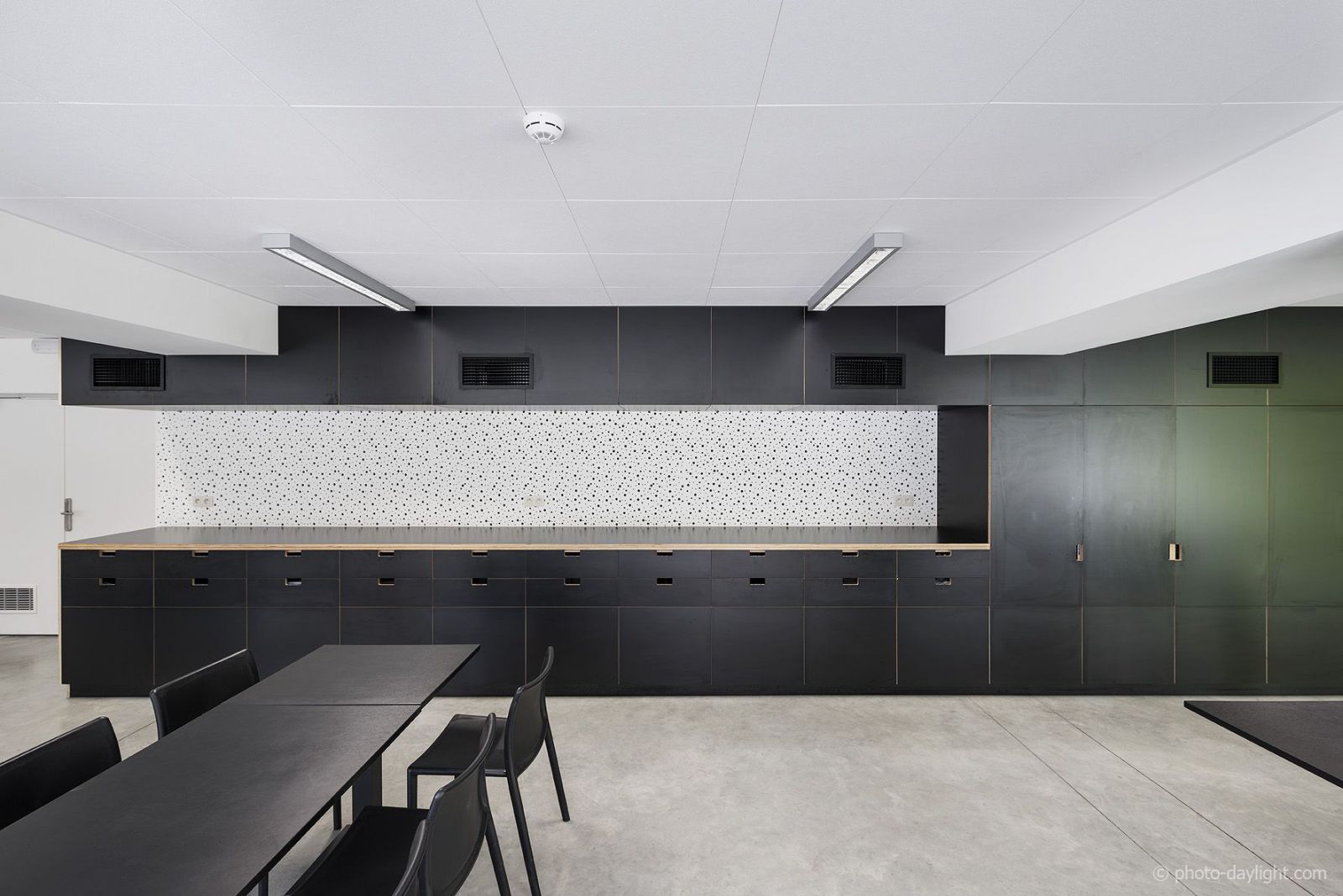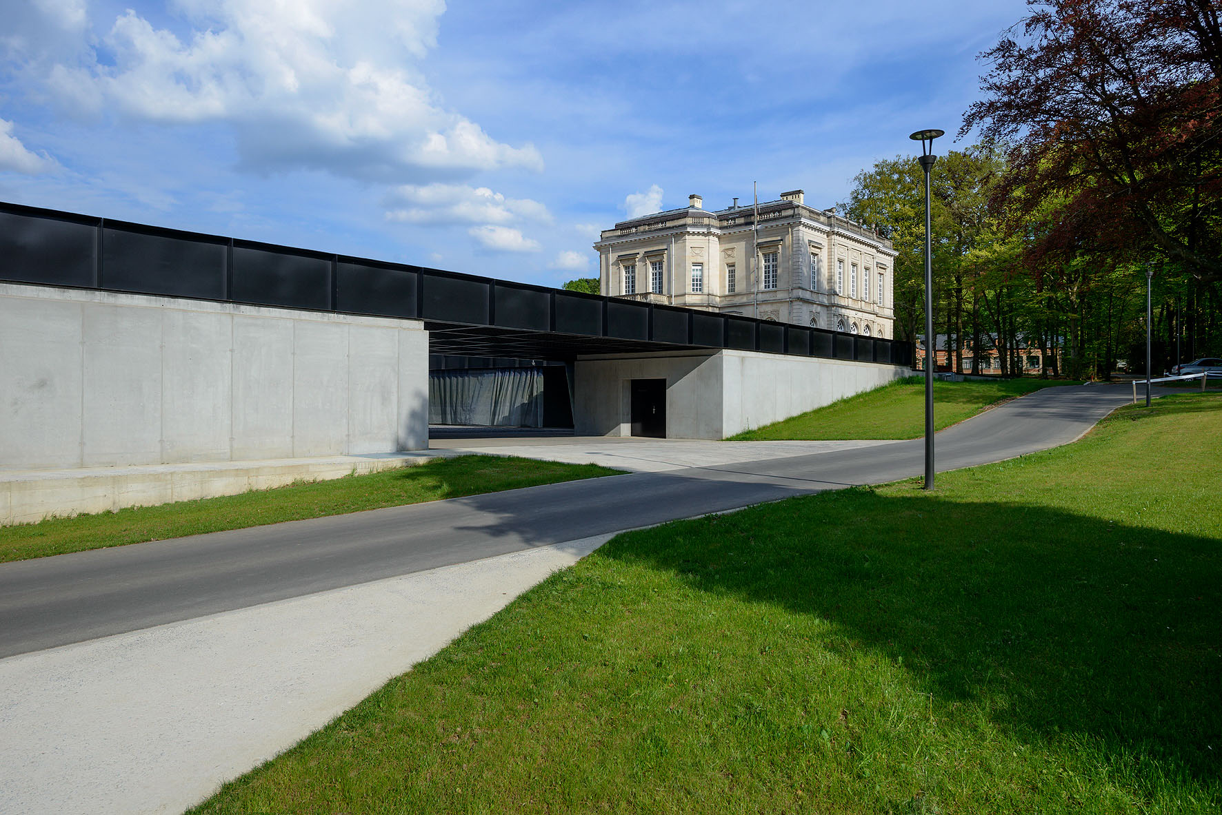 Les murs monolithiques en béton isolant de 60 cm d’épaisseur sont structure, architecture et isolation. Ceux-ci contrastent avec les grands pans de verre qui illuminent les différentes pièces. Les différentes fonctions sont réparties dans trois pôles, mais une charpente métallique réunit l’ensemble sous cette grande gaufre noire.